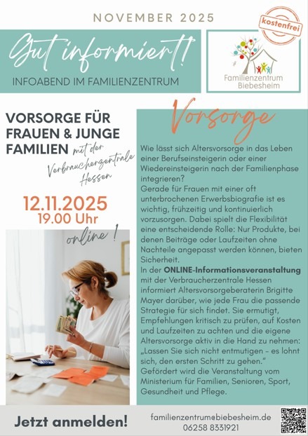 Am 12.11.2025 bietet es gemeinsam mit der Verbraucherzentrale Hessen eine Infoveranstaltung zum Thema „Altersvorsorge für Frauen und junge Familien“ an. Die Veranstaltung ist Online und es kann bequem von zu Hause teilgenommen werden. Ebenso ist die Veranstaltung kostenfrei. Anmeldung unter familienzentrum@biebesheim.de