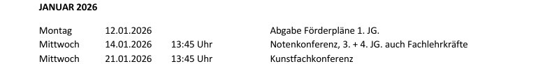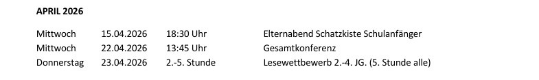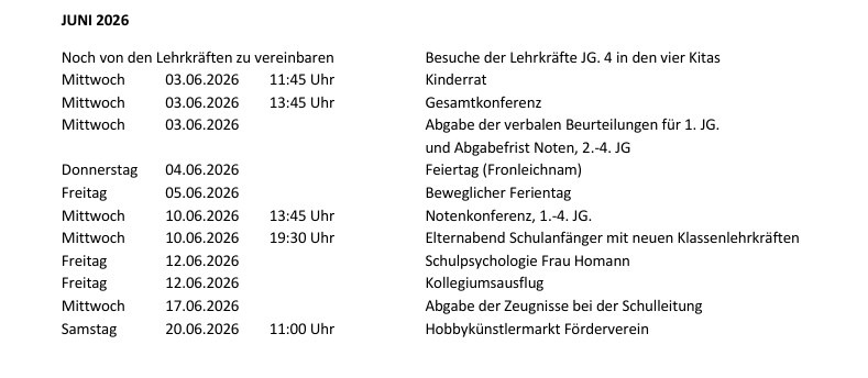 Hier finden Sie die geplanten Termine. Terminänderungen sind jeweils rot markiert.